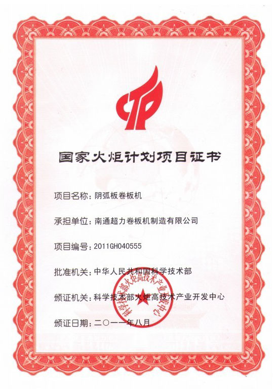 今年2月,南通超力卷板機制造有限公司正式接受到國家科技部頒發的“陰弧板卷板機”火炬計劃項目證書。至此,該火炬計劃項目正式立項。